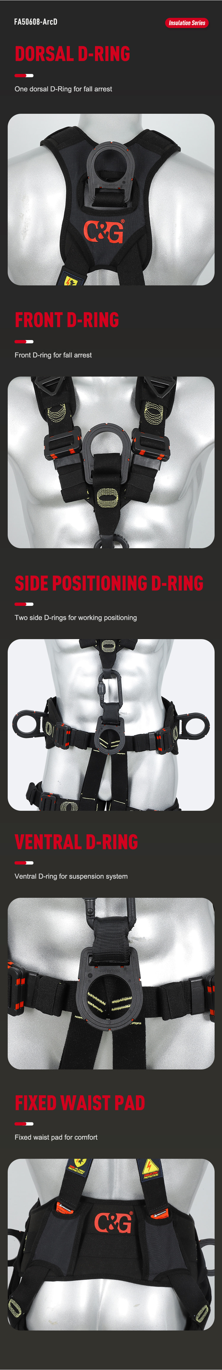 Model FA50609-ArcD 5 x Attachment point Construction Climbing Arc Flash Premium Full Body Harness with 9kV rated overmolded Normal connect chest and