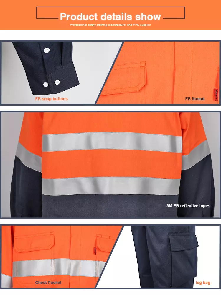 resistant fabric, Orange and navy blue blend, 3M FR reflective tapes on