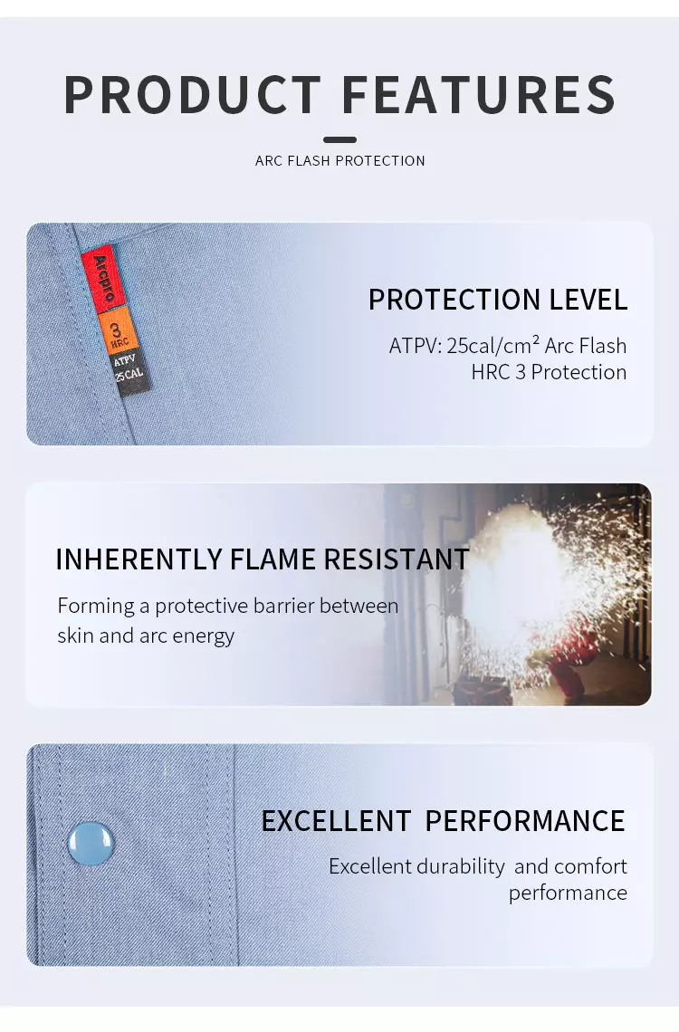This Arc Flash suit utilizes high-performance Arcpro fabric, which is our company's self-developed high-performance material. It has inherent flame-resistant and oil-repellent properties. This means that even in the event of an arc flash incident, the fabric will not burn, providing critical protection for the wearer. The protection level of the suit is ATPV 25 cal/cm², meaning it can withstand 25 calories of heat per square centimeter without causing second-degree burns to the wearer. Additionally, it has an HRC 3 protection rating, suitable for electrical work in high-risk environments. The fabric's inherent flame-resistant features ensure that it will not burn or melt during an arc flash event while forming an effective protective barrier that isolates arc energy from the wearer's skin. This not only enhances the wearer's safety but also improves the overall protective performance of the suit. This Arc Flash suit is widely used in the electrical industry, especially in high-risk environments with arc flash hazards, providing reliable protection and safety assurance. |