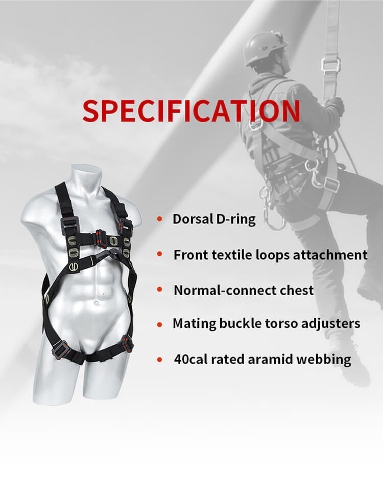 | Features | • Dorsal D-ring • Front textile loops attachment • Normal-connect chest • Mating buckle torso adjusters • 40 Cal rated aramid webbing |