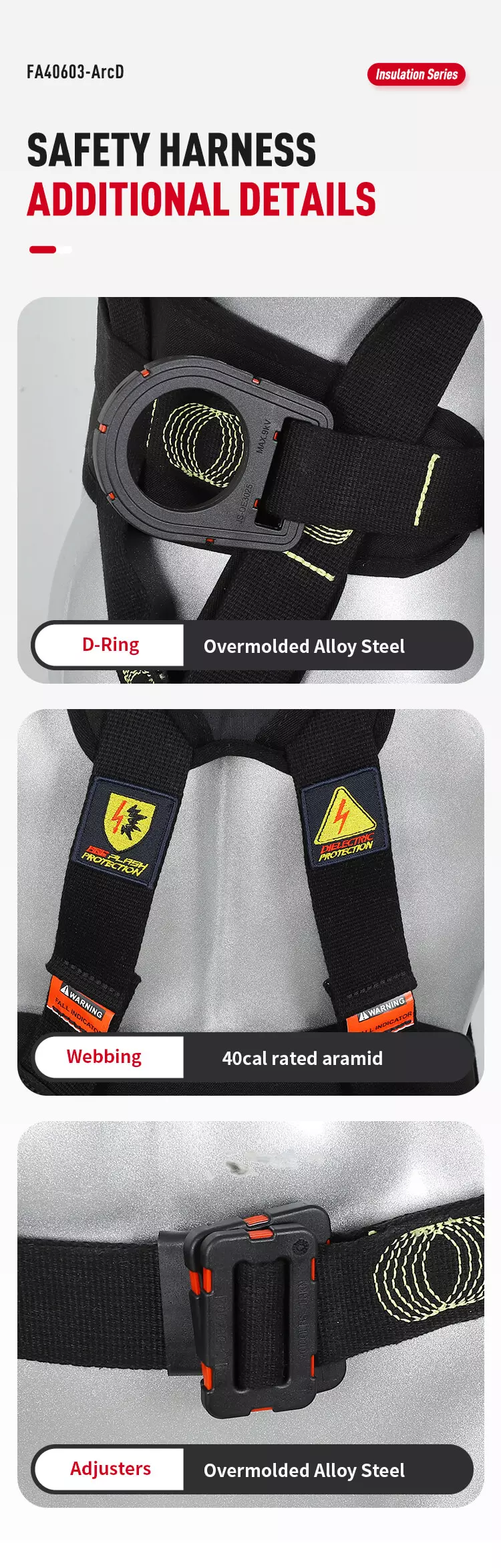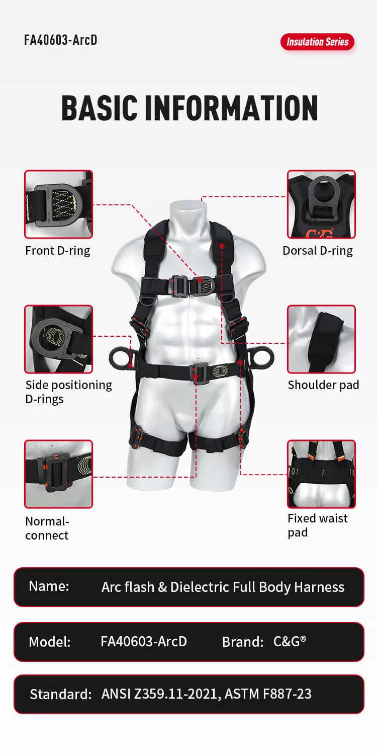 Model FA40603-ArcD 4 x Attachment point Construction Climbing Arc Flash Premium Full Body Harness with 9kV rated overmolded Normal connect chest and
