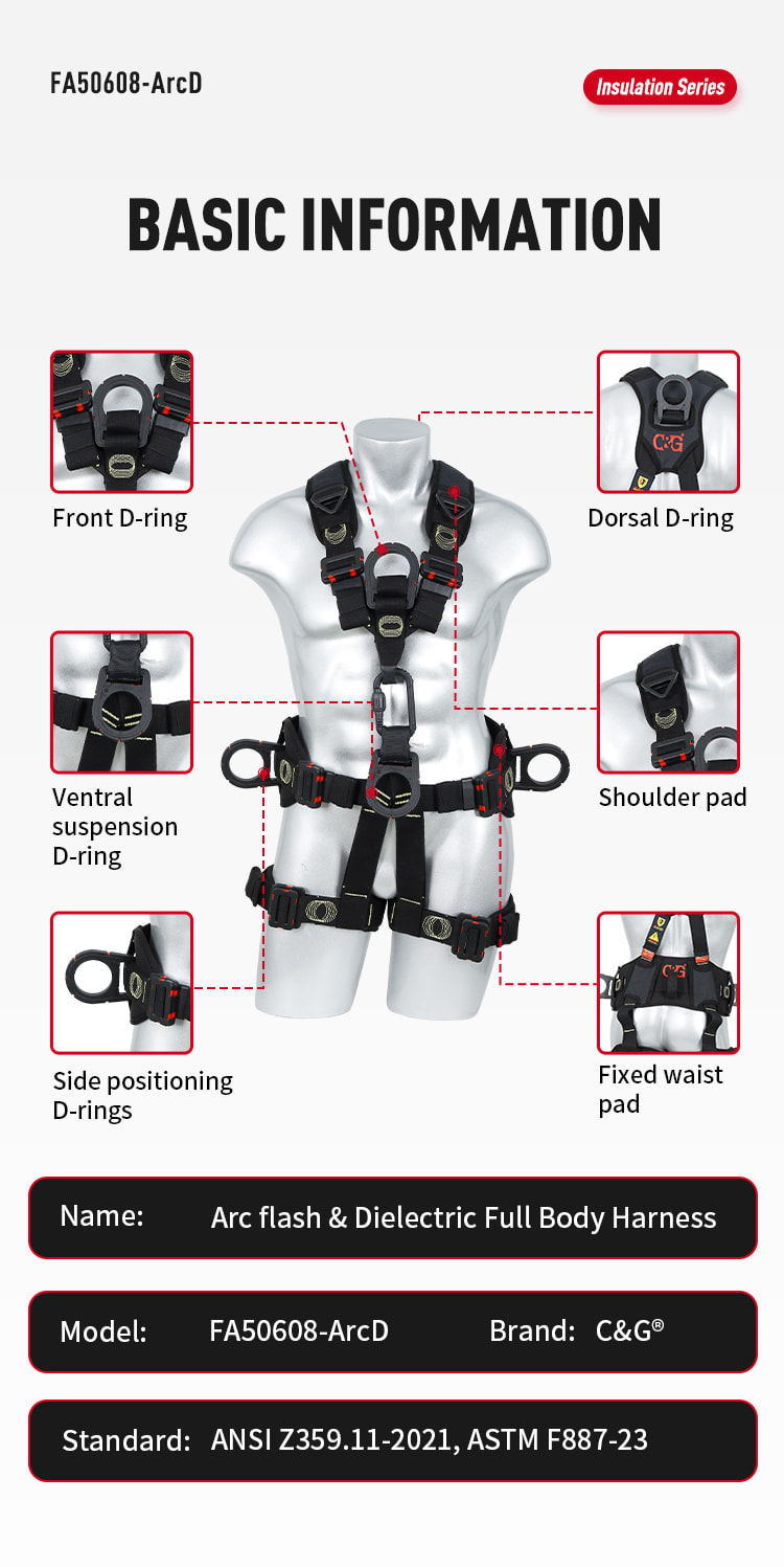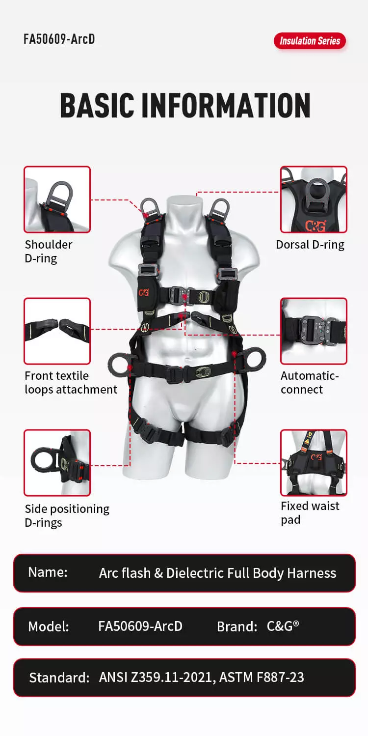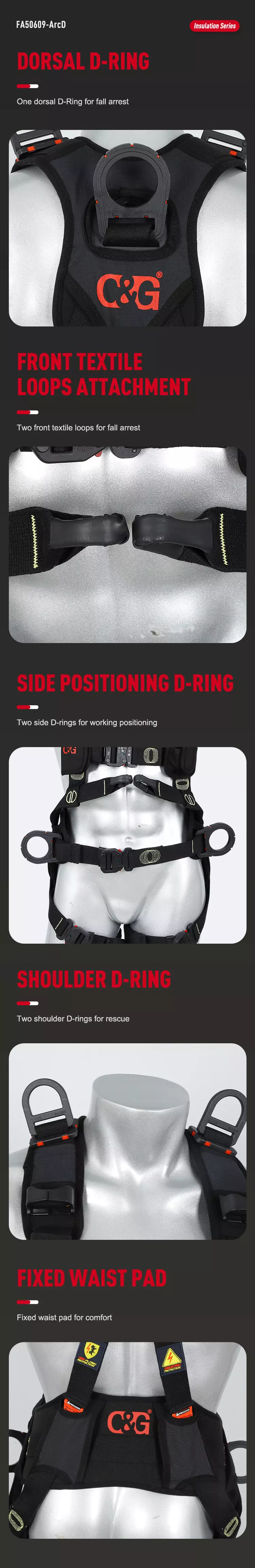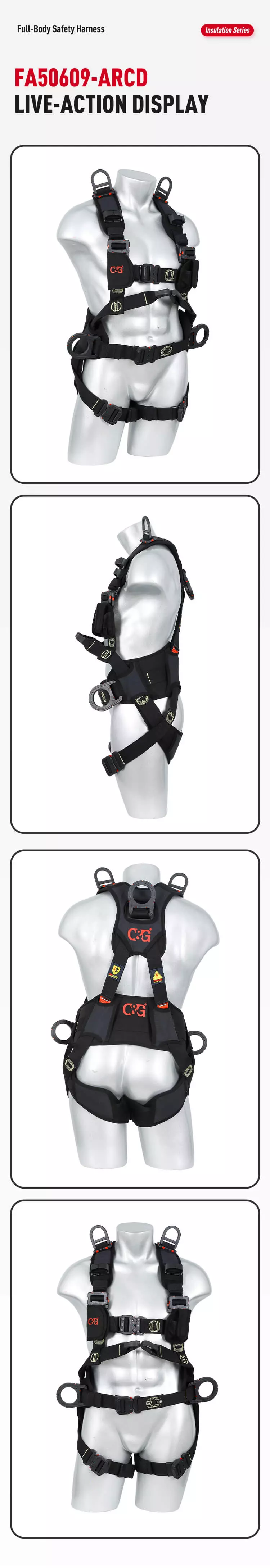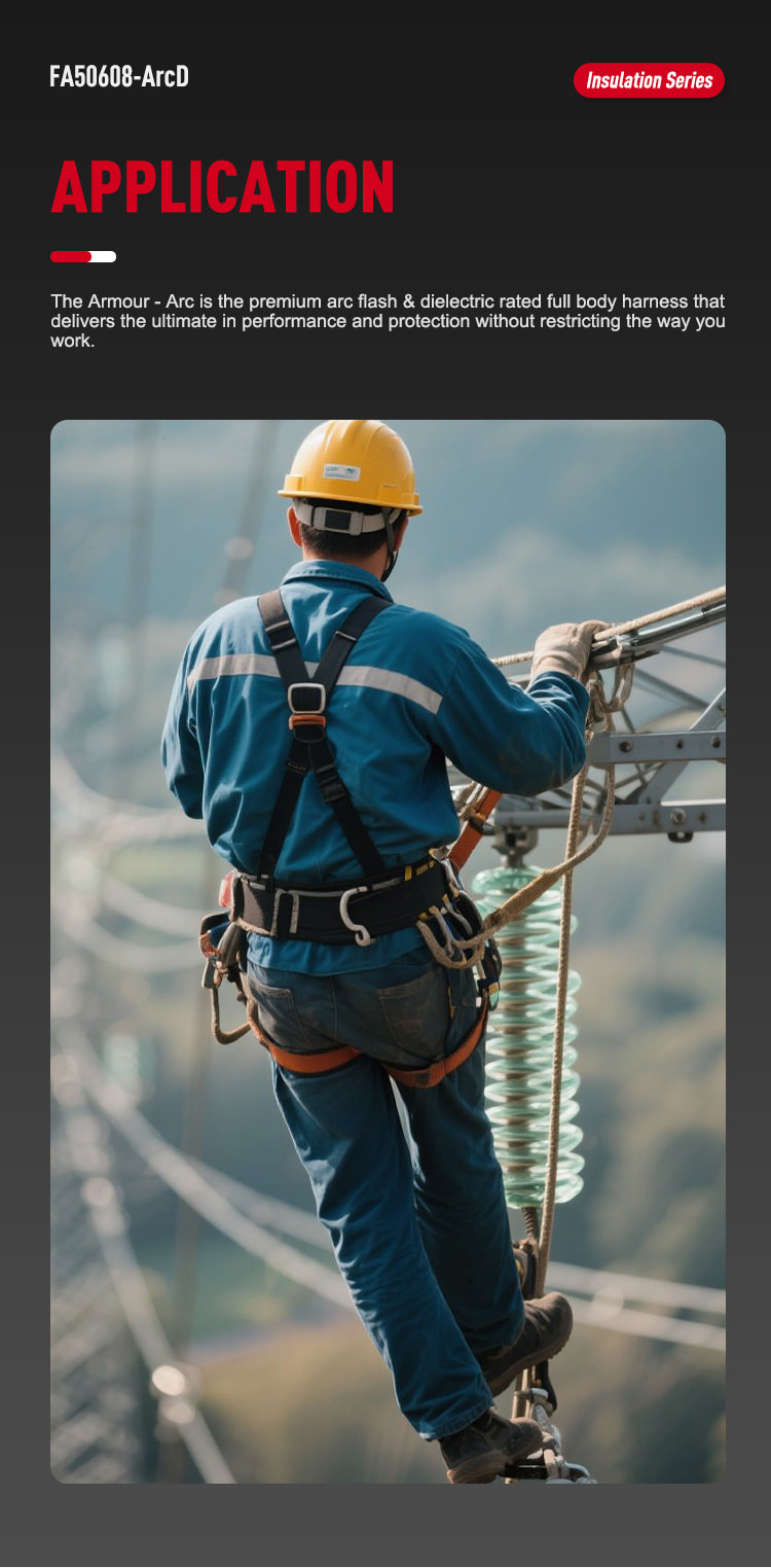 Model FA50609-ArcD 5 x Attachment point Construction Climbing Arc Flash Premium Full Body Harness with 9kV rated overmolded Normal connect chest and